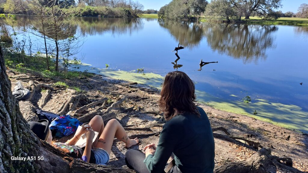 We sat on the seats in the bus opposite each other and the whole way to Stockton, the end of the first transfer, she told me what’s what and the history of Sacremento and California. She told me to take note of the houses and observe what type of lives they live and the background they have by looking at how small the house is, the rubbish thrown around and the amount of cars there are “and there isn’t a party and that’s not a garage, that’s how many people live in that one house”. She said between Sacremento and the mountains is mostly agricultural land. “There used to be a lot of fruit trees but the labour required was huge. Since Trump got rid of the immigrants in his first presidency there weren’t enough workers so farmers started to grow nut trees instead, almonds mostly and fig trees. A machine goes around the trunk of each tree and shakes it and that’s how they get the nuts. Look, the blossom on the almond trees is starting to come out because the weather is getting warmer the more south we are going so the blossom is coming out earlier on those trees.”
